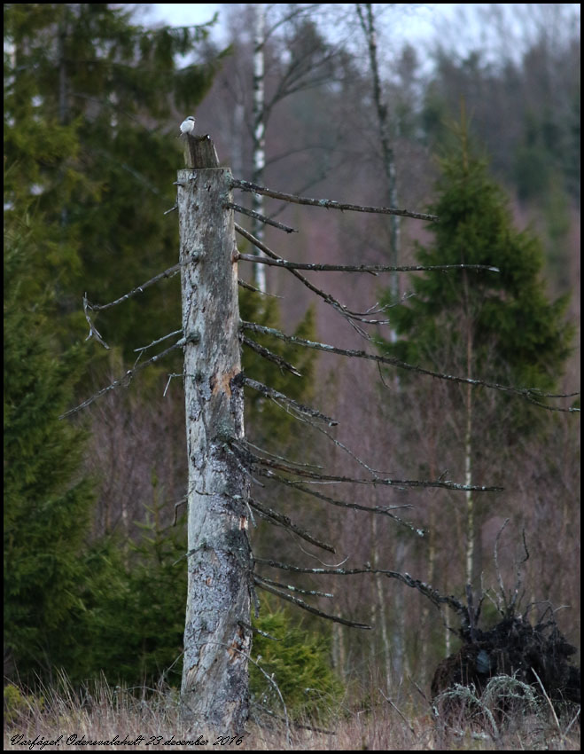 | 23 december. Jag har letat efter en möjlig kungsörn idag. Den passerade västerut vid Rönnekulla igår men hela tiden glidande bortåt mot väster. Men jag hittade ingen, däremot ännu en varfågel, spanande från en kvarlämnad stam på ett hygge. |