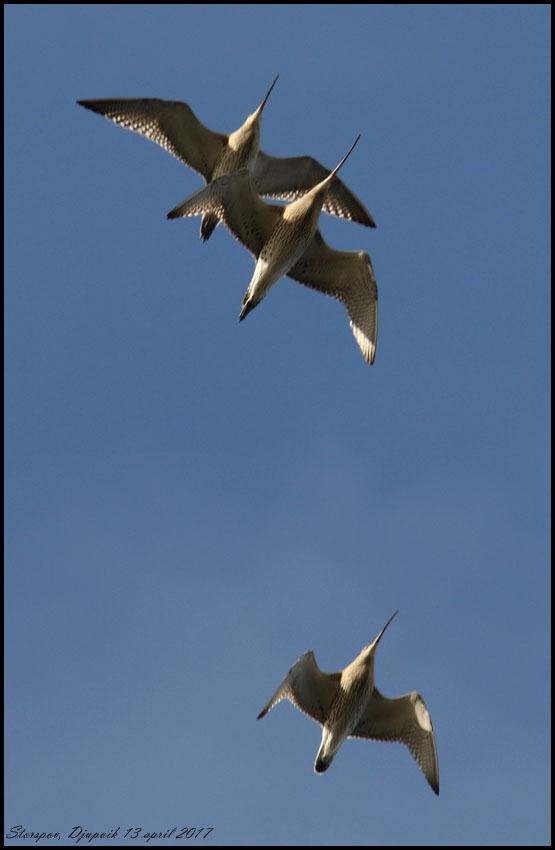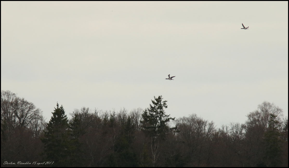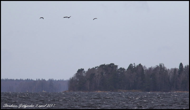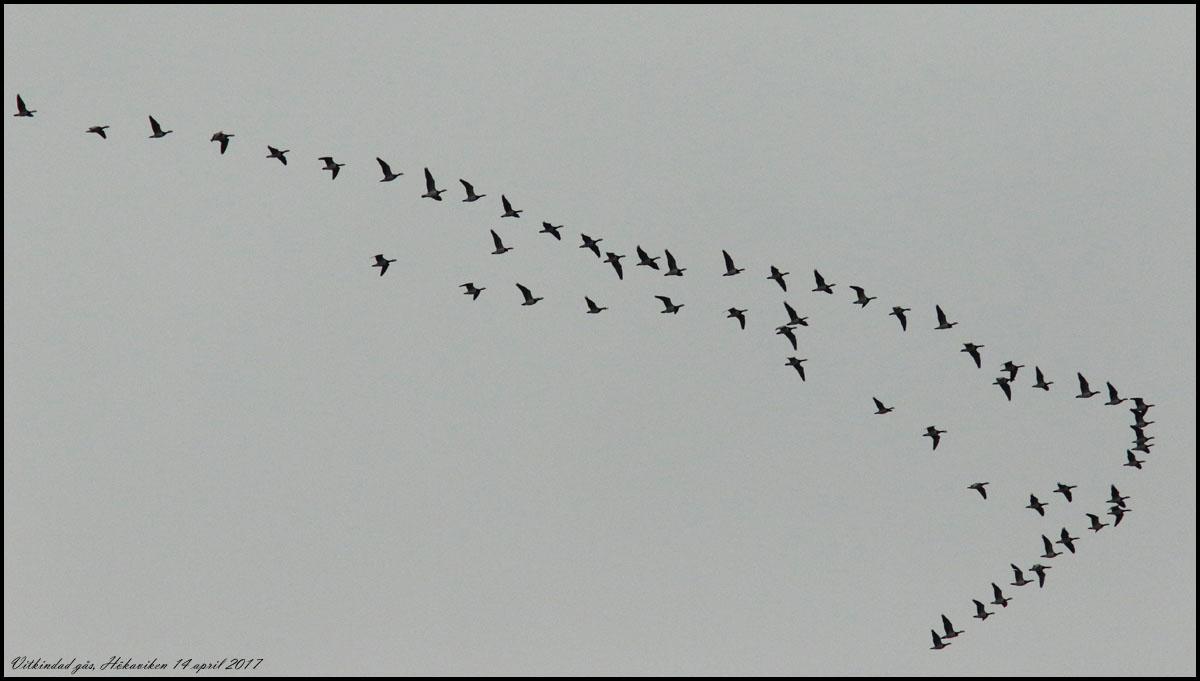 14 april. På plats på Hökaviksudden. Hård vind och tre plus. Inte mycket fåglar men storspovar och en flock vitkindade gäss.