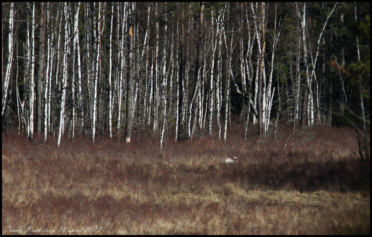 | 18 april. Första besöket i Kråketorpsreservatet med studiecirklarna. Trana i kärret längs ån. |