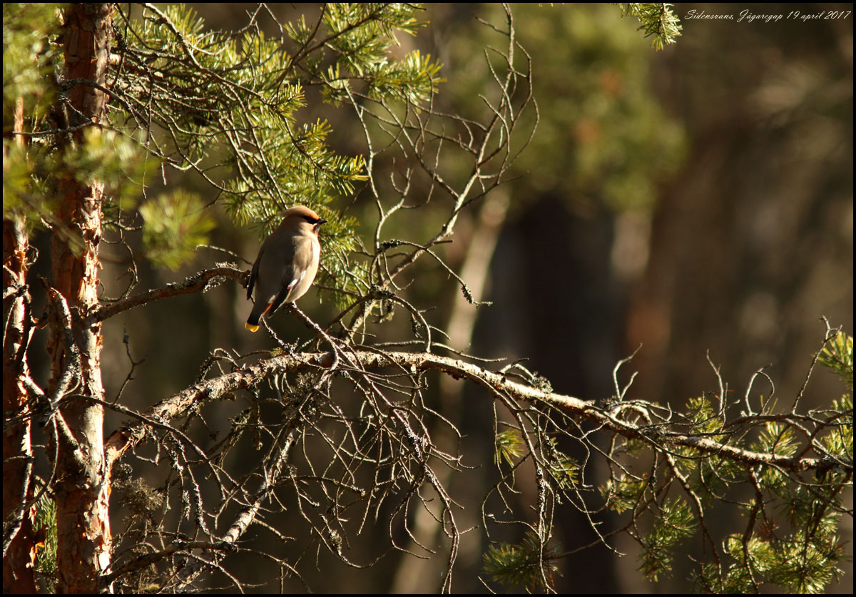 | 19 april. Efter dagens besök i Kråketorpsreservatet tillbringade jag några timmar på Helgö och Jägaregap. Här fanns en sen flock med sidensvans. De jagade insekter intill den solbelysta skogen men ibland var de bland tuvorna i kärret intill. Fanns där gamla bär? | |