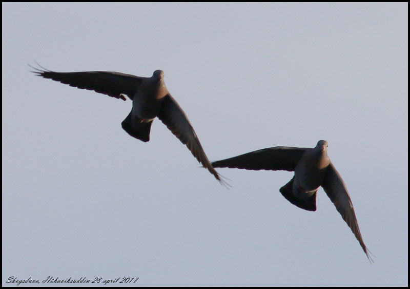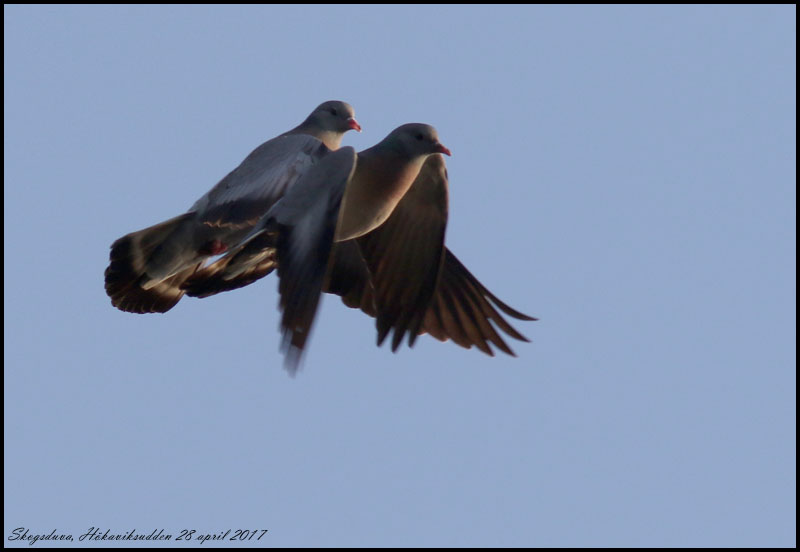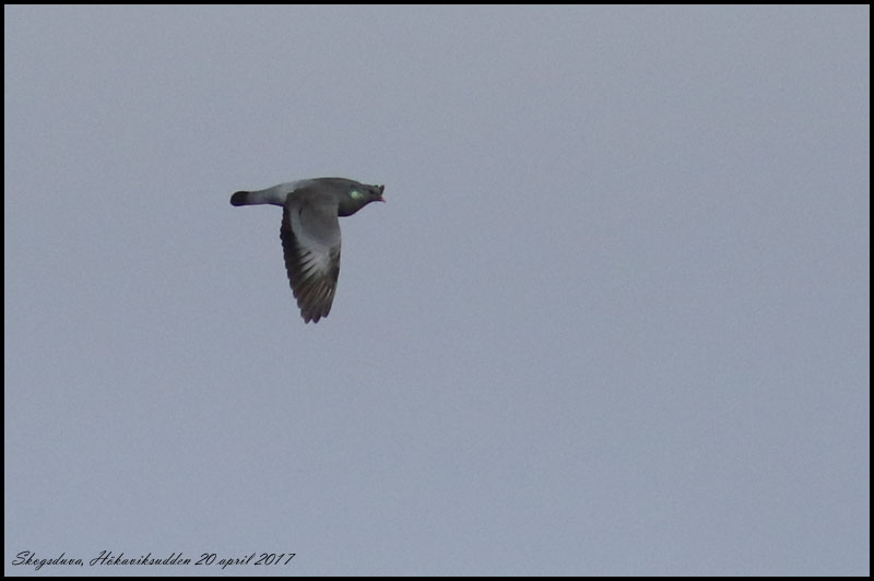 | 20 april. Klart, kallt o blåsigt på udden idag. En storspov, tre svärtor och några sträckande storskarvar hörde till de flyttande arterna. De andra som sågs är häckande i området. Som skogsduvan som tog sig en sväng runt udden. |
