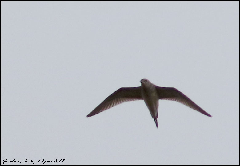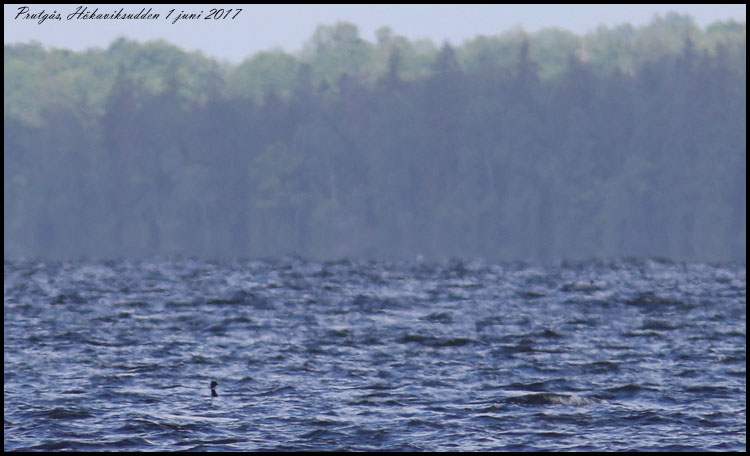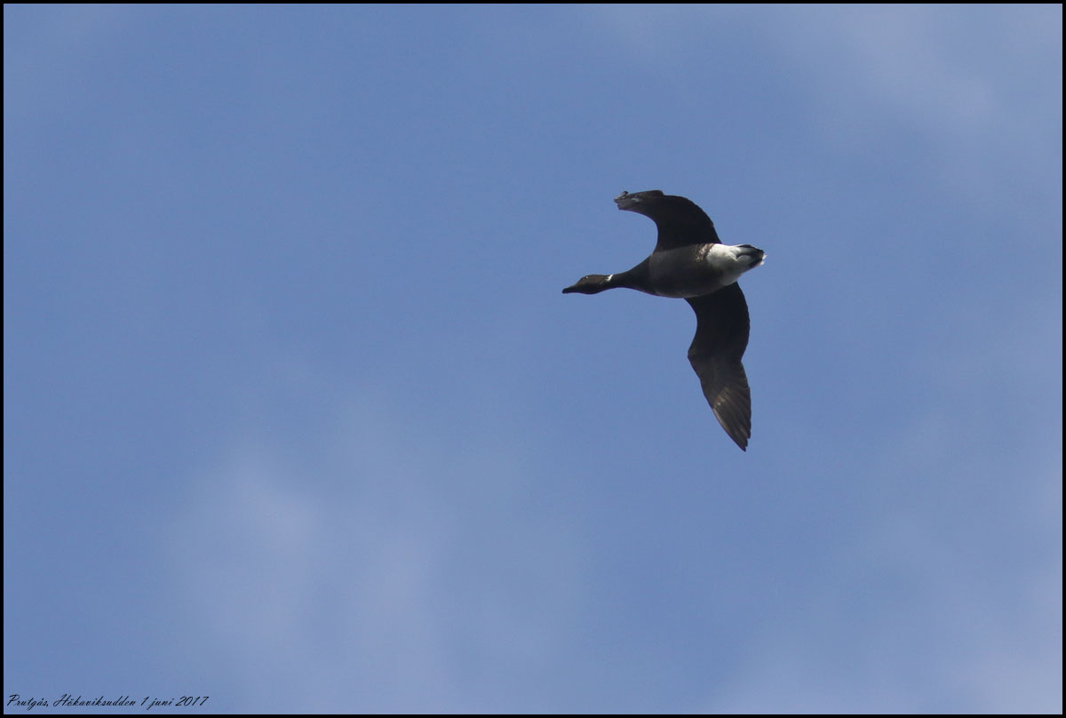 | 1 juni. Jag hade tur idag! På vårens kanske sista besök på Hökaviksudden för att titta på sträckande marina arter fick jag glädjen att hitta prutgås. En ensam vilsekommen individ som inte hittade ut ur sjön. Tre försök gjorde den men gick sedan ner för landning. 1½ timme senare låg den kvar ute på fjorden. |