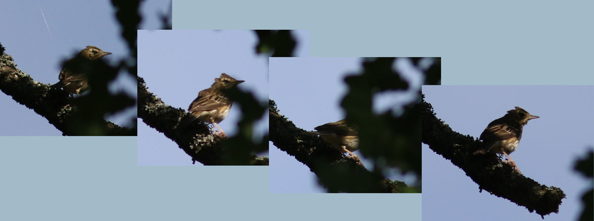 Fågelfoto är sällan lätt. Bilden på trädpiplärkan blev ju rätt bra men den bilden var den enda av de åtta som jag hann ta innan fågeln flög iväg. Här nedan finns fyra av de mindre lyckade bilderna. De förstördes av grenen som vinden blåste framför och när den inte gjorde det så hamnade fågeln i skugga av en annan gren. Men en bild, de övre blev ju som sagt rätt okej. |