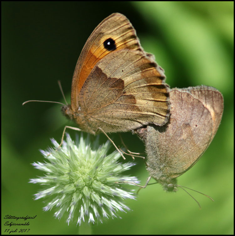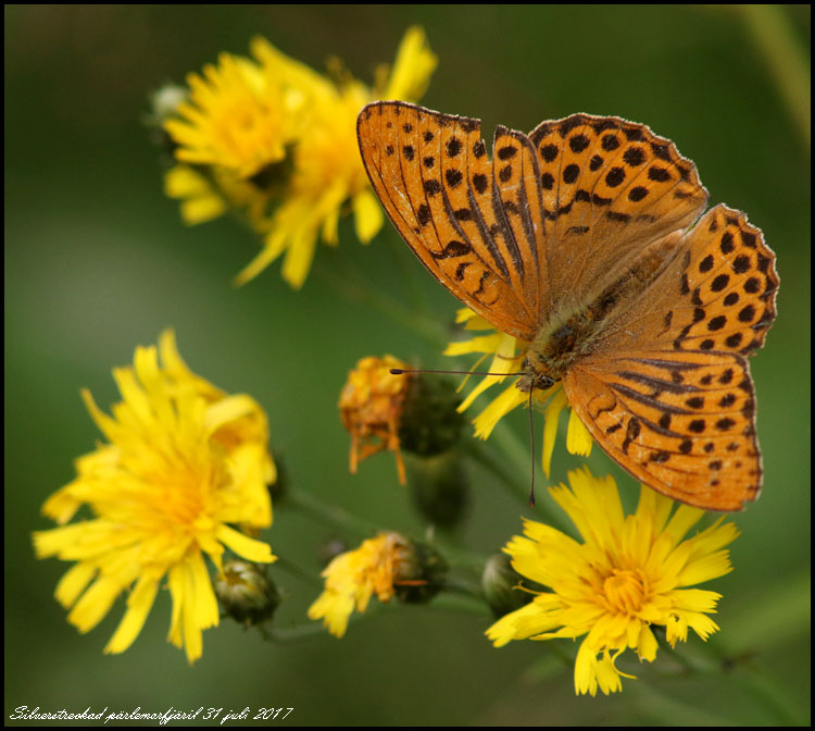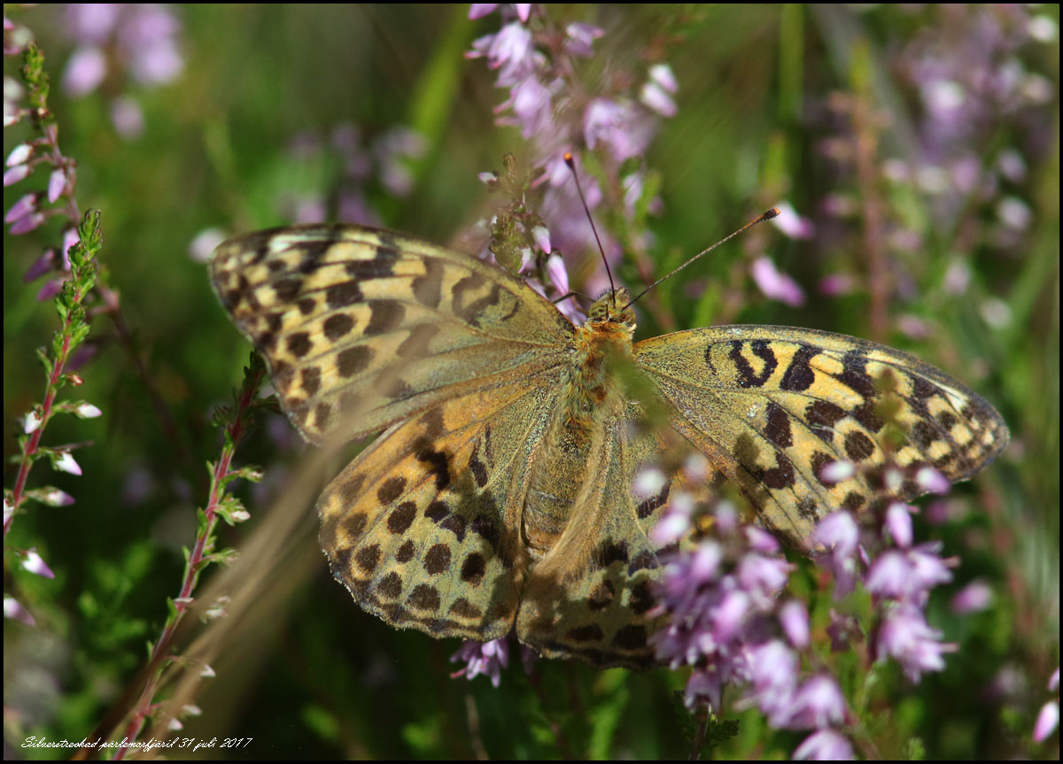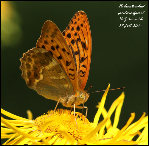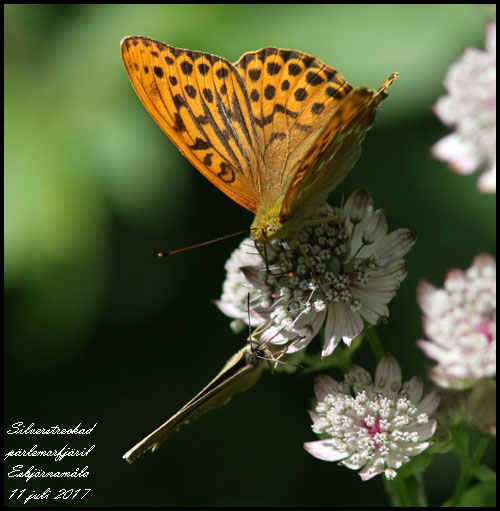 | 11 juli. Slåtter- och luktgräsfjäril finns det gott om i trrädgården. En silverstreckad pärlemorfjäril, en skogsnätfjäril och två silverblåvingar dessutom. |