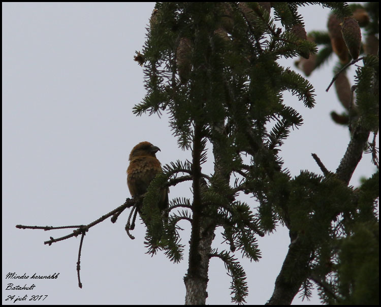 | Under våren har vi inte haft några korsnäbbar men nu hör man dem dagligen. Mindre korsnäbb. |