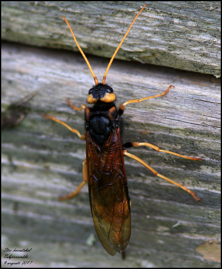 | 9 augusti. En kort stund fick jag sällskap av en stor hornstekel hemma i trädgården. |