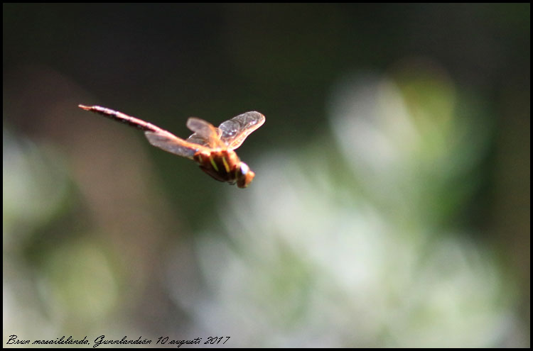 | 10 augusti. Det är inte lätt att fotografera sländor i luften, dt här blev det minst dåliga resultatet efter tjugo minuters ansträngning. Det är väl en brun mosaikslända. |