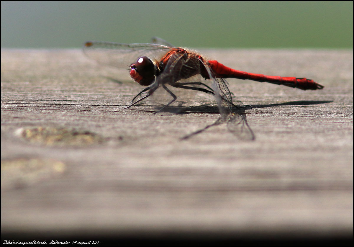 | 6 augusti. På en tur i trädgården fick jag bilder på en trollslända som jag tror är en tegelröd ängstrollslända. Tvåfärgade ben och mörk mustasch i ansiktet är visst typiskt. |