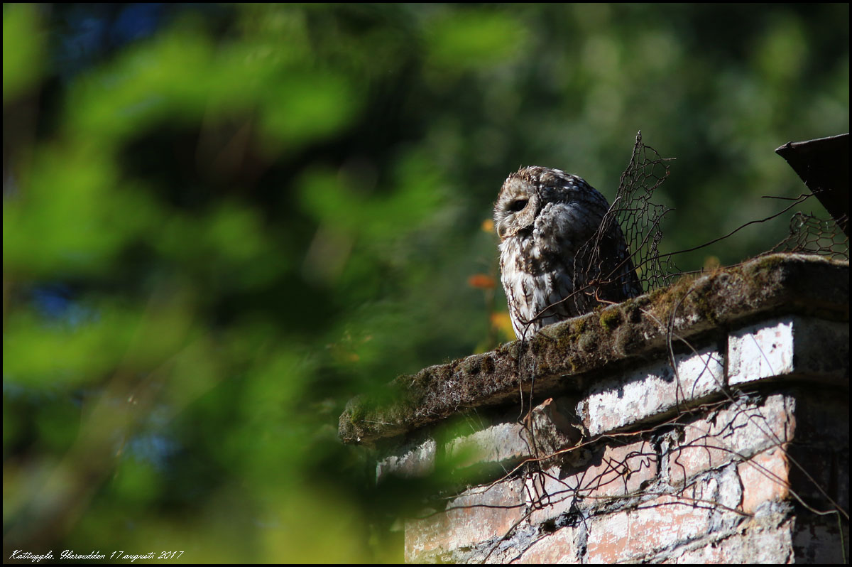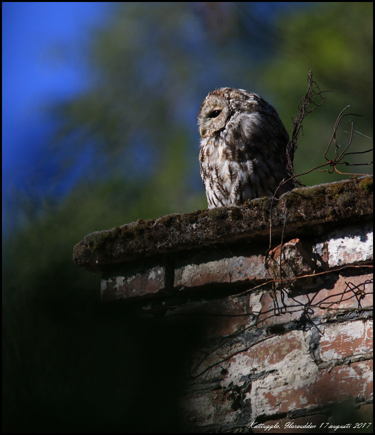| 17 augusti. Strålande solsken idag. Jag cyklade till Ilareudden.Nötskrikor väsnades och en kattuggla ropade två gånger i solskenet. Ugglan satt på husets skorsten. |