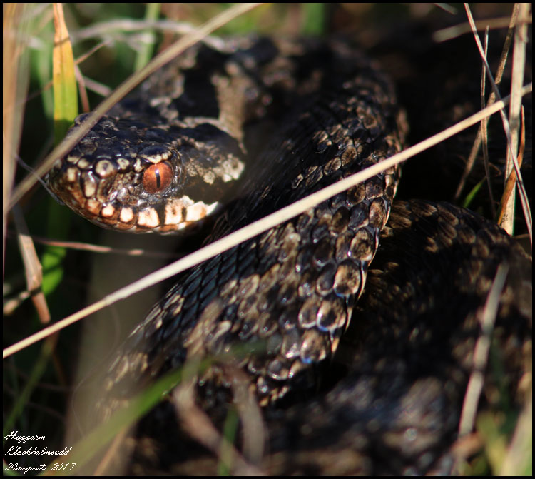 Vid promenaden ut på Klockholmsudd upptäckte vi en huggorm, faktiskt helt nära foten. Men den låg blickstilla! |
