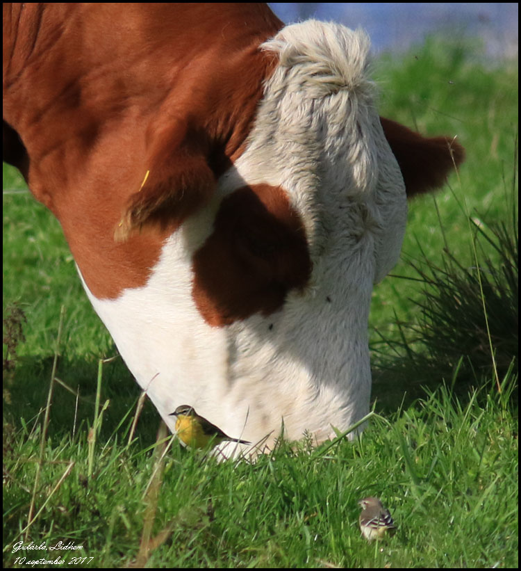 | 10 september. Idag sprack molntäcket upp efter en grå och stundtals regnig vecka. Vid Lidhem rastade gulärlor. De sökte föda intill de betade djuren. |