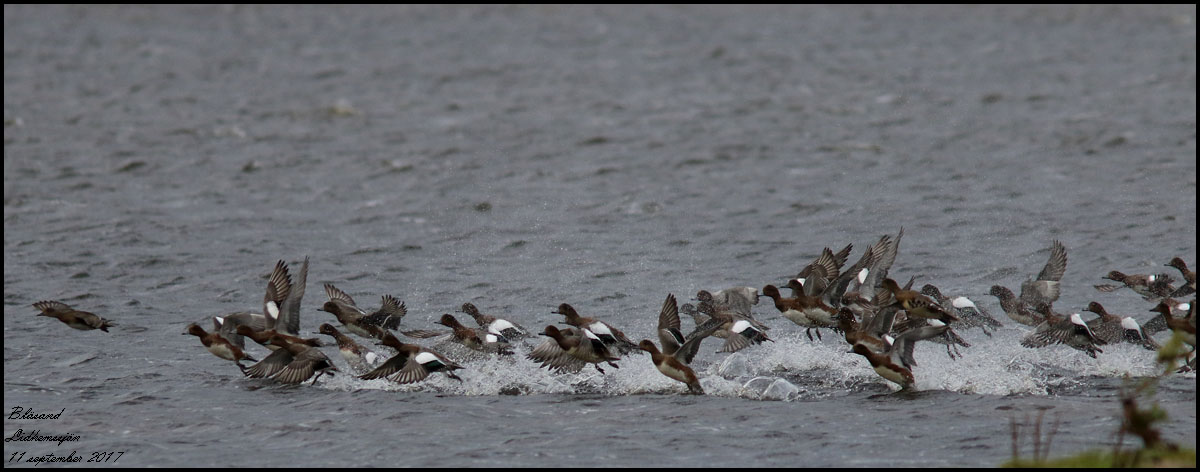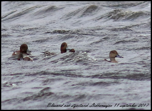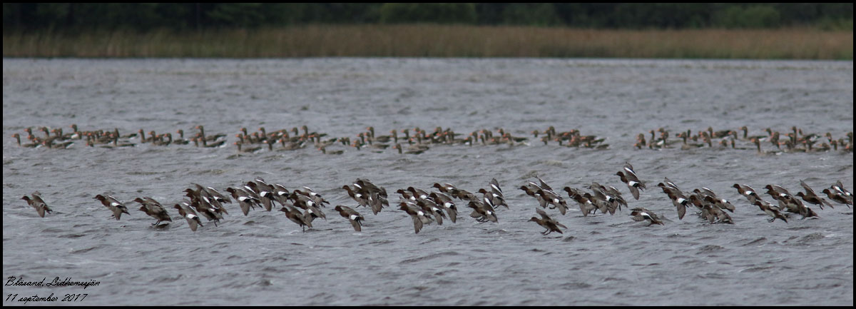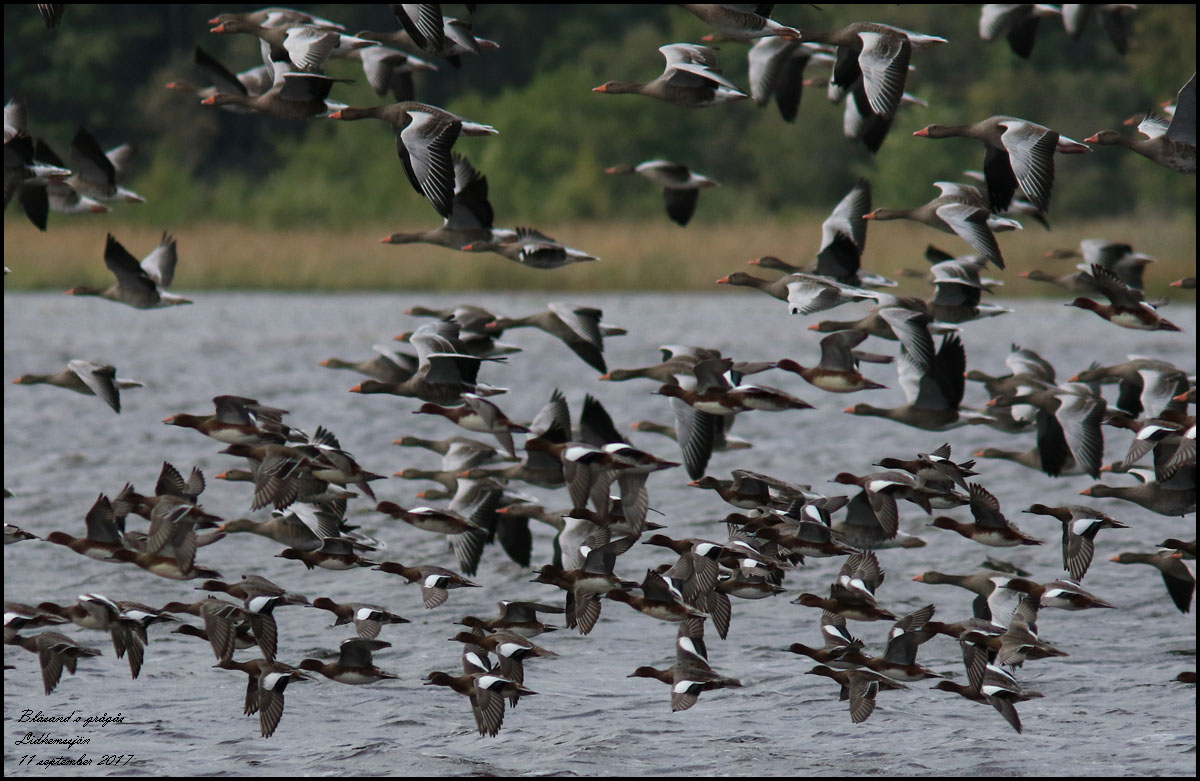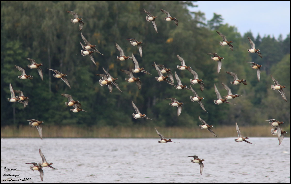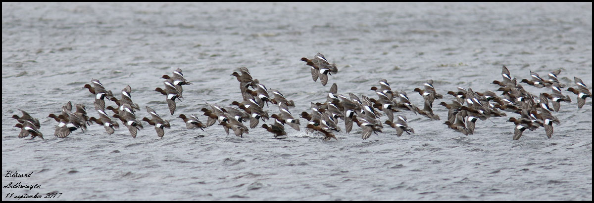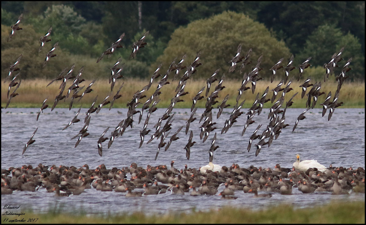 | 11 september. En ovanligt stor flock av bläsänder rastar vid åmynningen i Lidhemssjön. Det blev många bilder! | |