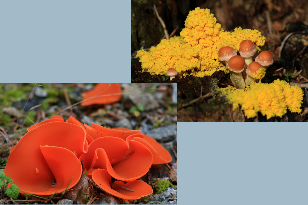 Mycket svamp i skogen och några är ordentligt färggranna! Den oranga svampen är väl mönjeskål. Och den gula är trollsmör tror jag. |
