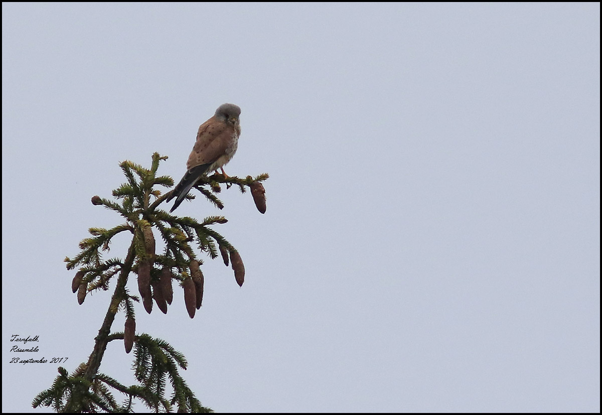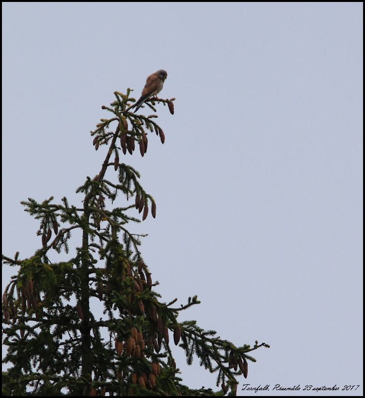 | 23 september. På dagens promenad passerade vi ovanför bergtäkten vid Rössjön. En adult tornfalkshanne spanade från en grantopp. |