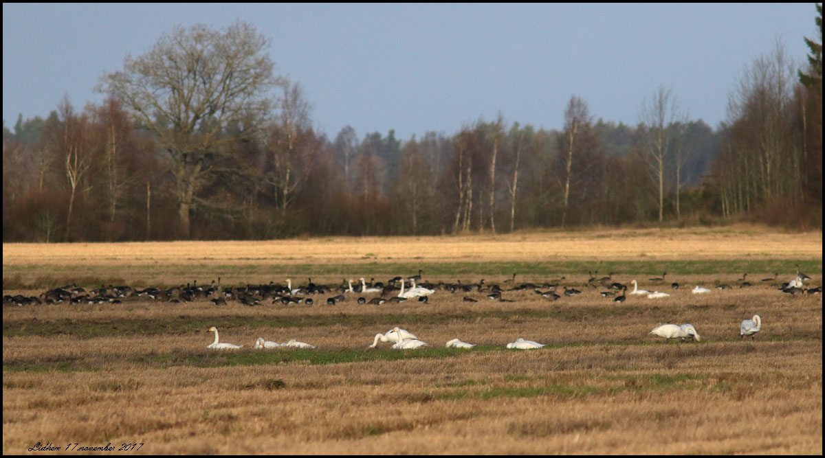 Lidhem. Ca tjugo spetsbergsgäss och ännu fler bläsgäss. Över hundra