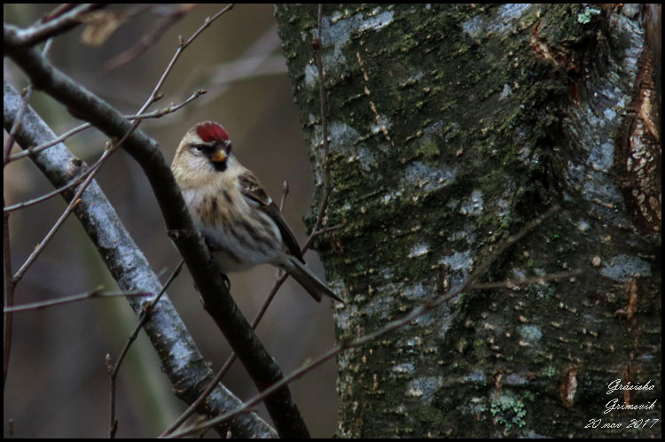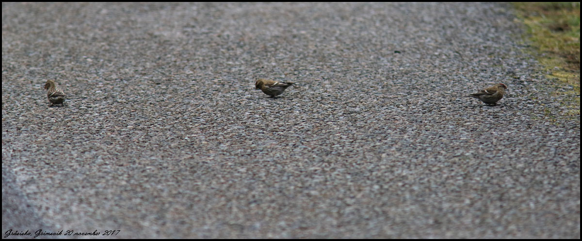| Gråsiska. Tre exemplar hoppade runt på landsvägen vid Grimsvik. |