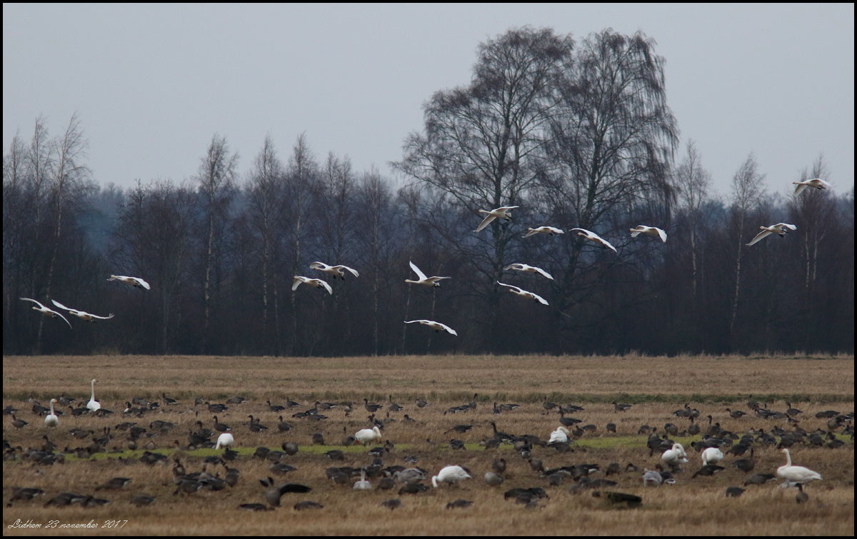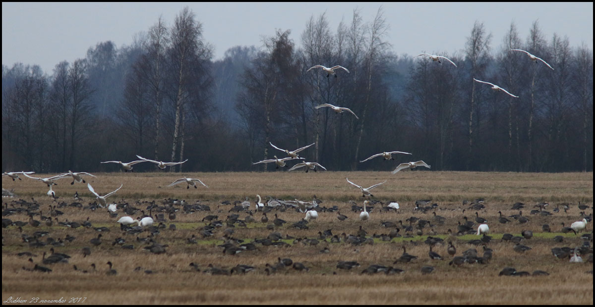 Många gäss och sångsvanar vid