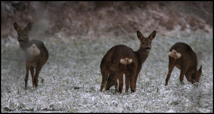 | 30 november. Lite snö idag! Rådjur vid Solbergs. |