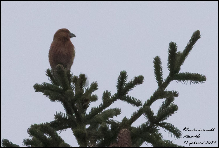 | 11 februari. Inte mycket fotograferande de senaste dagarna. Mest gråväder. Mindre korsnäbb med typisk näbbprofil från dagens promenad i Rössmåla |