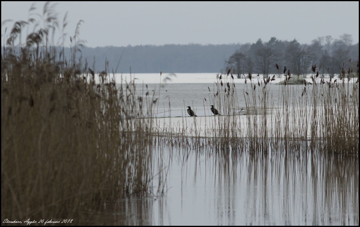 Storskarvar vid Aggåns utlopp i Åsnen. Hela Jätfjorden är istäckt utom utanför åmynninghen. |