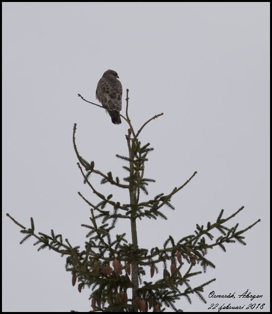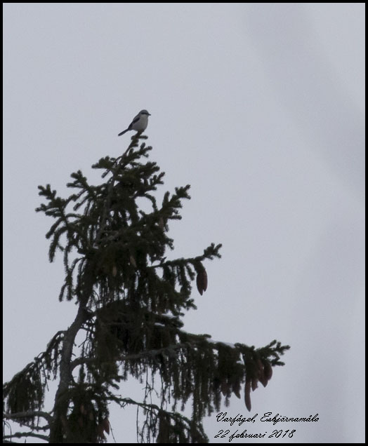22 februari. Två grantoppsfåglar! Ormvråken fanns längs vägen till Älmhult. Varfågeln upptäcktes när jag åt lunch hemma i köket. Således en tomtart men inte nytt tomtkryss, den är sedd en gång förut under våra tio år i Esbjörnamåla. |