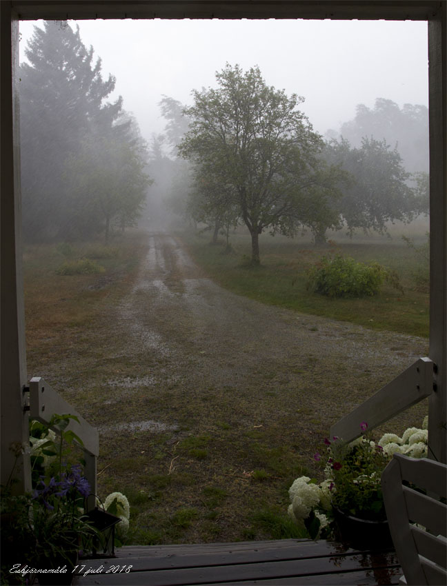 en störtskur samtidigt som åska dundrade på någora kilometers