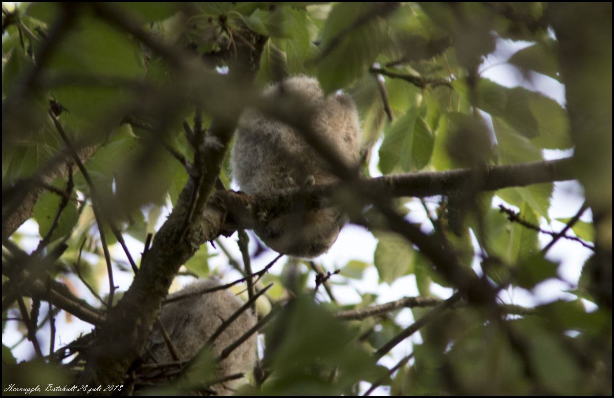 28 juli. På kvällen besökte vi Botahult för att avnjuta hornugglor. De har häckat i ett körsbärsträd i ett skatbo inne på en tomt. Tre ungar gick att se i bladverket. |