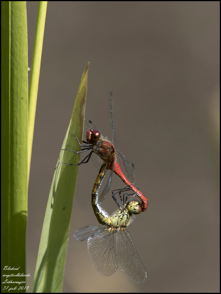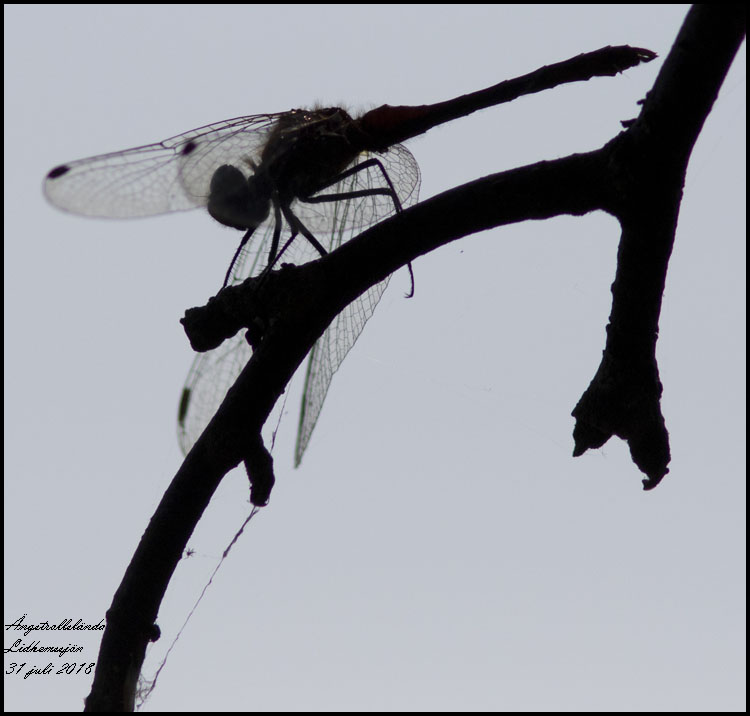 Tegelröd ängstrollslända i toppen på mitt gamla fjälltält |
