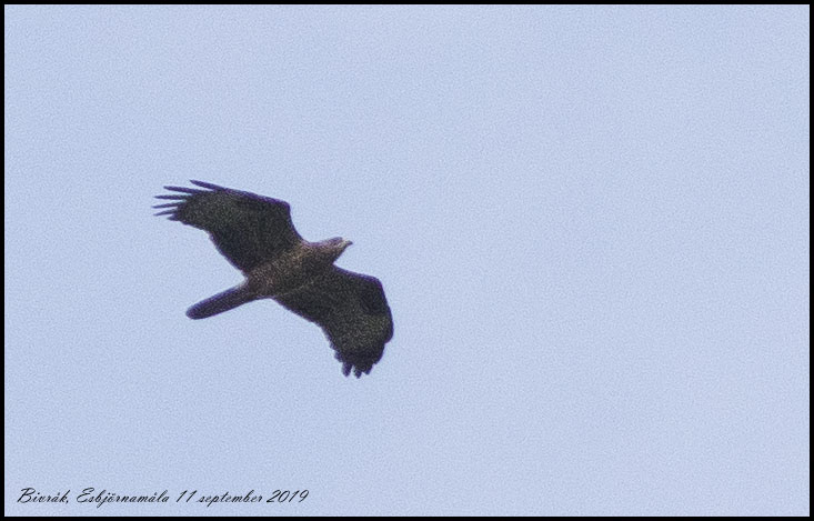 | 11 september. En stunds skådande vid lagårdsväggen gav ett femtiotal sträckande ladusvalor men också en något sen bivråk. Bilden är kraftigt croppad. |