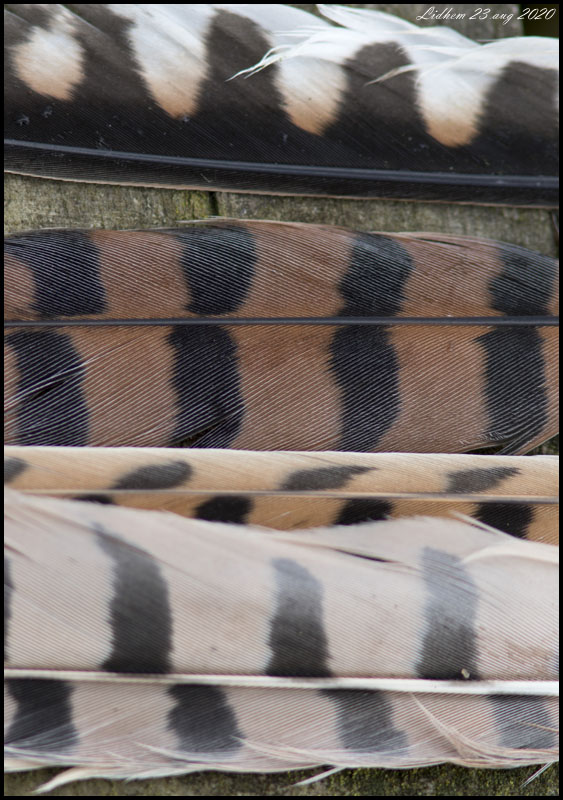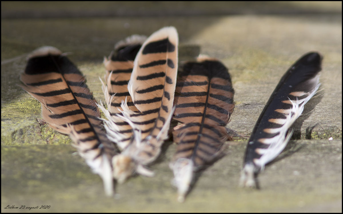 | 23 augusti. Några stjärtfjädrar och en handpenna fanns vid båtplatsen vid Lidhem. Borde väl vara tornfalk? |