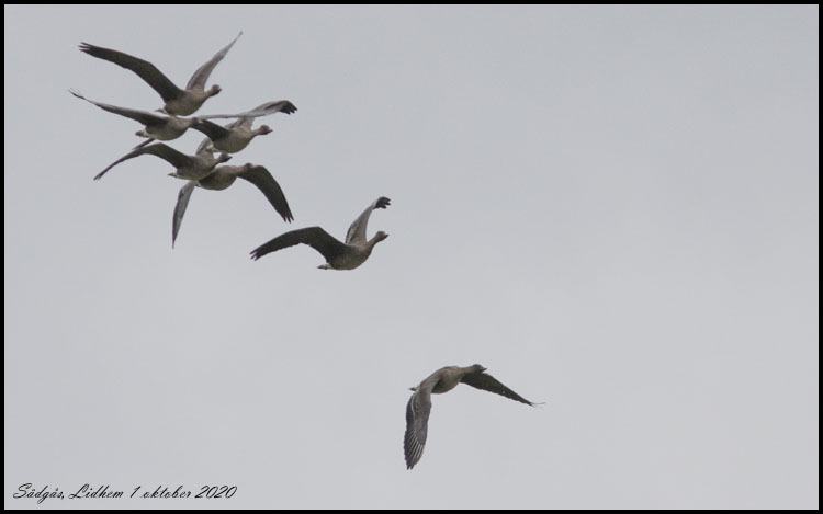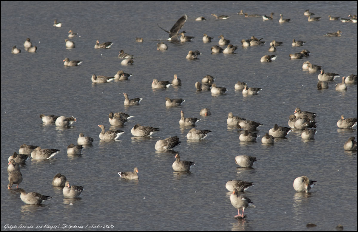 7 oktober. Nytt besök vid Lidhemssjön idag, den här gången i norra delen av sjön. Grågås finns i stora antal men dessutom säd- och bläsgås och vitkindad gås |