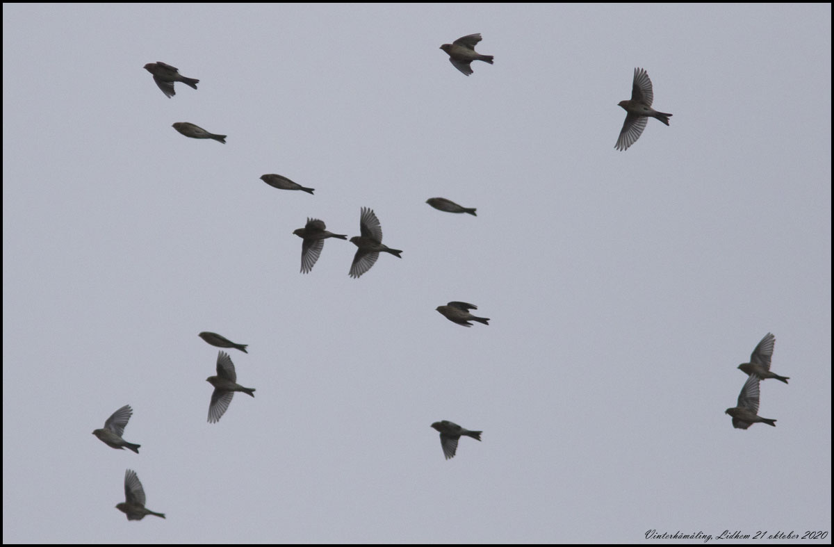 | 19 oktober. Croppad bild av en vinterhämpling. Minst ett 20-tal fanns på åkern vid Lidhem. |