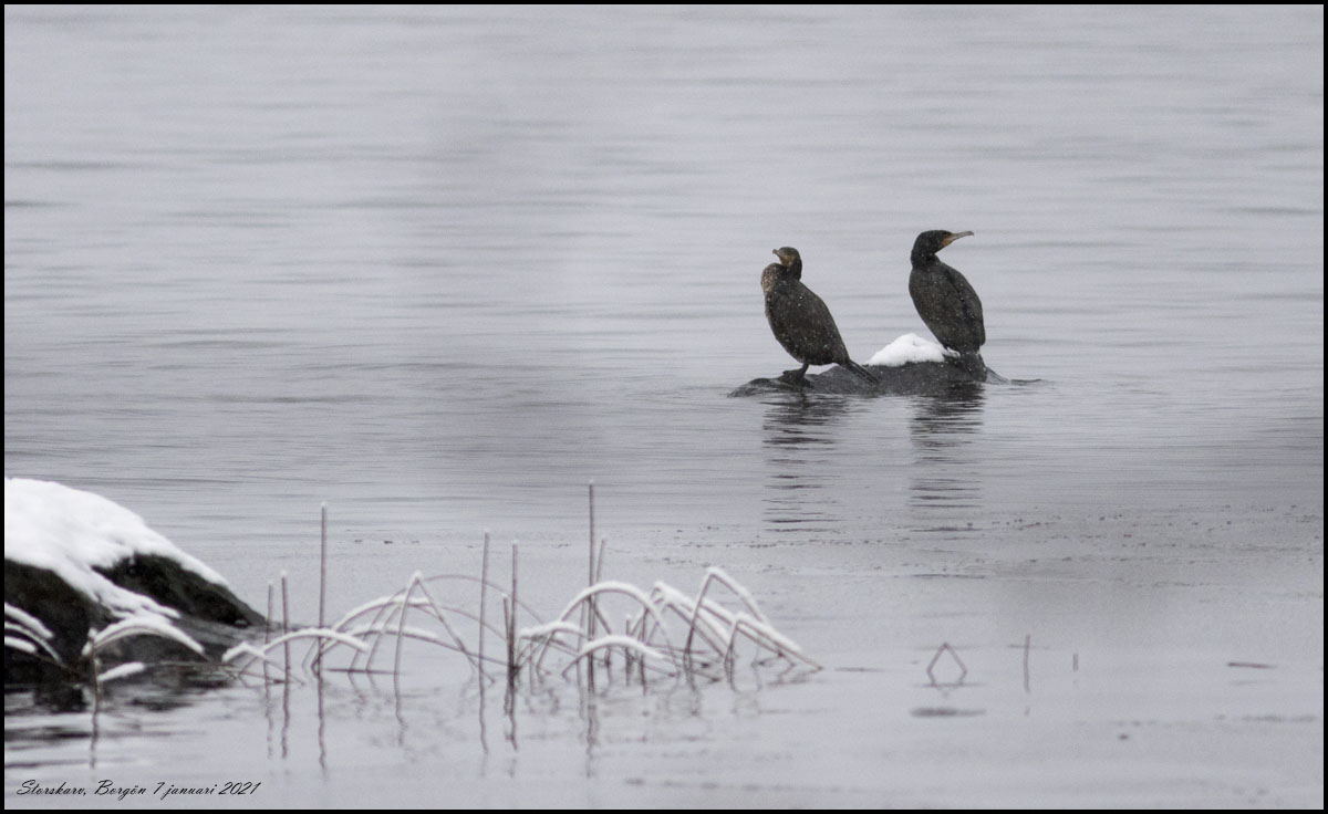 7 januari. Efter lite smygande i strandskogen kom jag hyfsat nära några storskarvar som stod utanför i snöyran. |