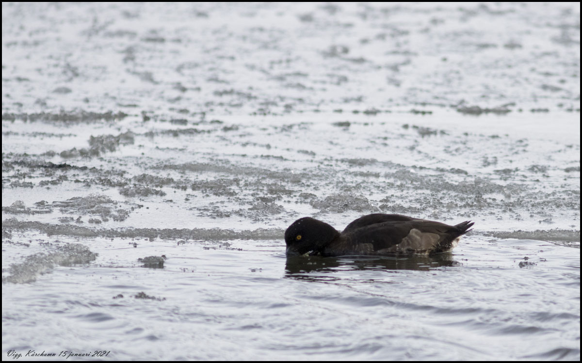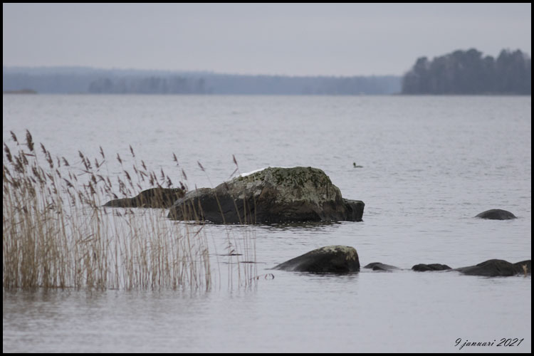 | 9 januari. Lite skådning på Hökaviksudden med bland annat två skäggdoppingar. Vattennivån är nästan återställd. Fågeln är en av cirka 40 storskrakar. |