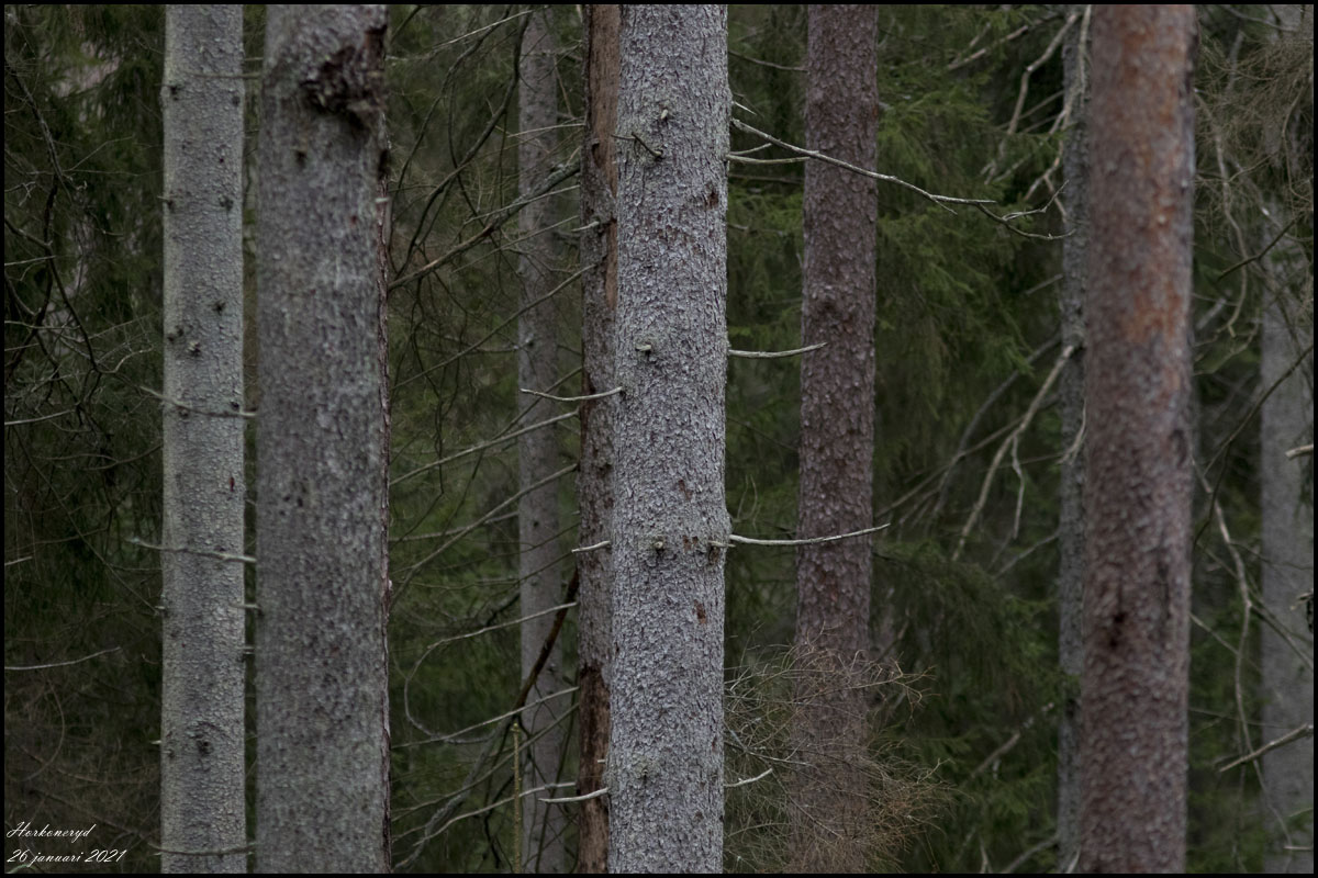 26 januari. Dagen har ägnats åt hökuggla som upptäcktes i slutet av förra året vid Horkoneryd. När vi var tillbaka efter över tre timmars letande satt ugglan helt nära bilen. |