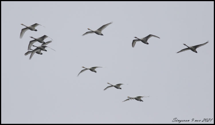 En grupp sångsvanar flög förbi |