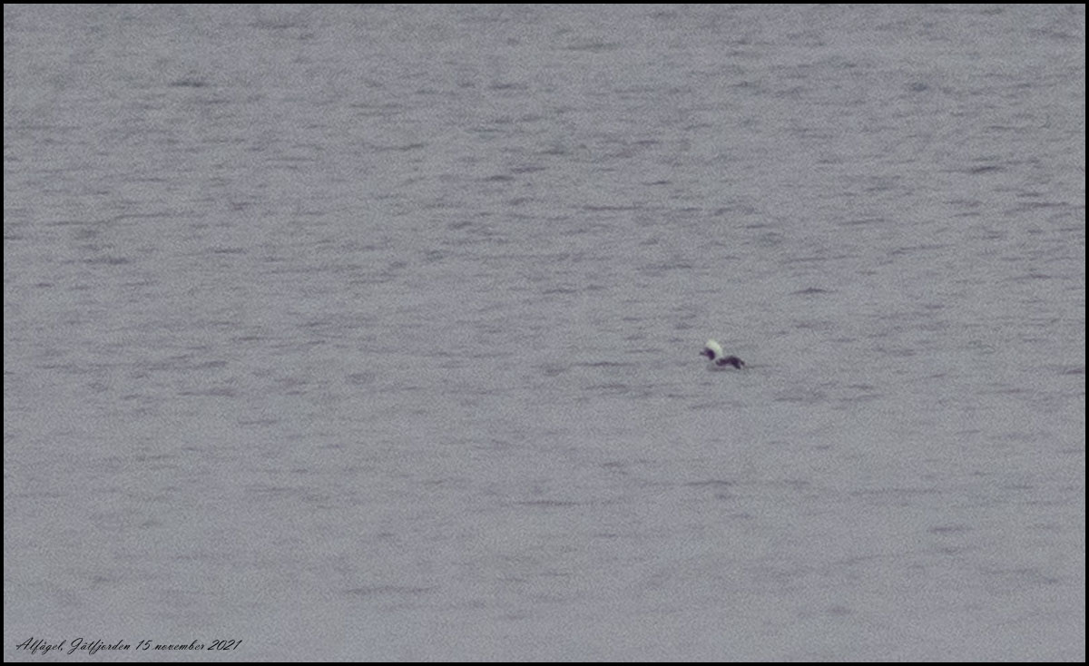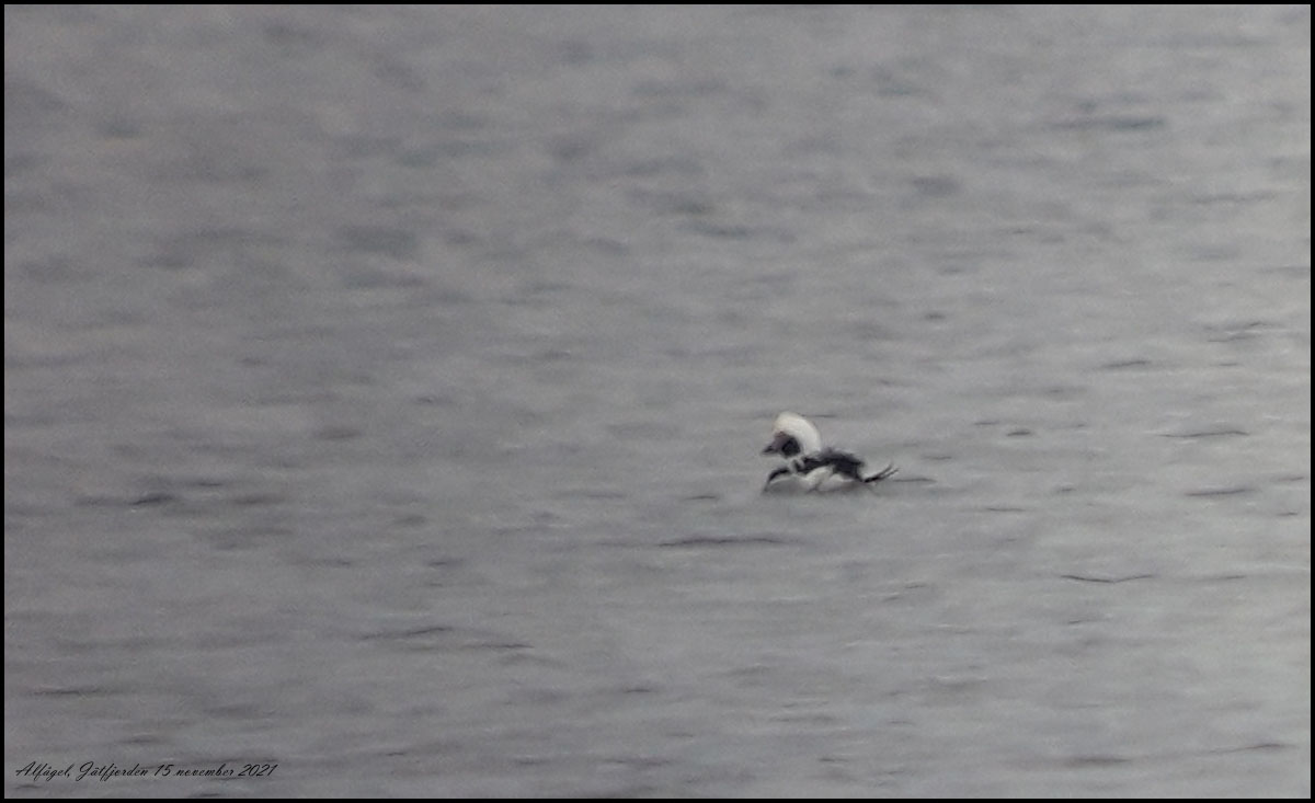 15 november. Alfågel på Jätfjorden, årets första fynd i Tingsryd! Den övre bilden är tagen med tele 300 mm och konverter 1,6. Den är sedan kraftigt croppad. Den undre är med tubkikare och mobiltelefon, likaså kraftigt croppad. Den senare klarar ju uppgiften riktigt bra. |