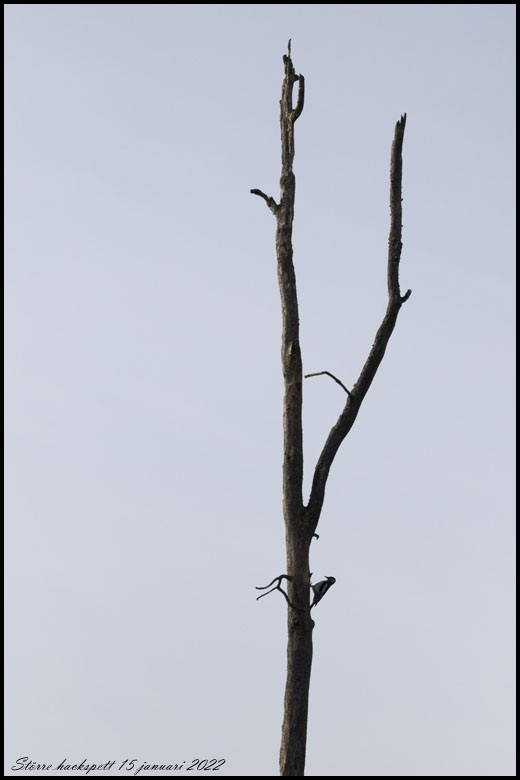 | 15 januari. Större hackspett jobbar med en kotte |