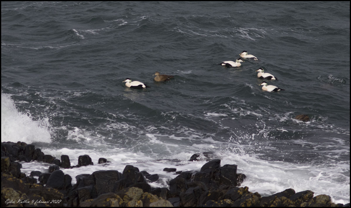 9 februari. Vi har hyrt en stuga i Jonstorp. Därifrån är det nära till Kullens fyr. Ejder. |