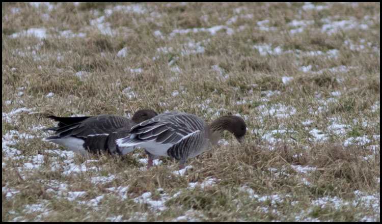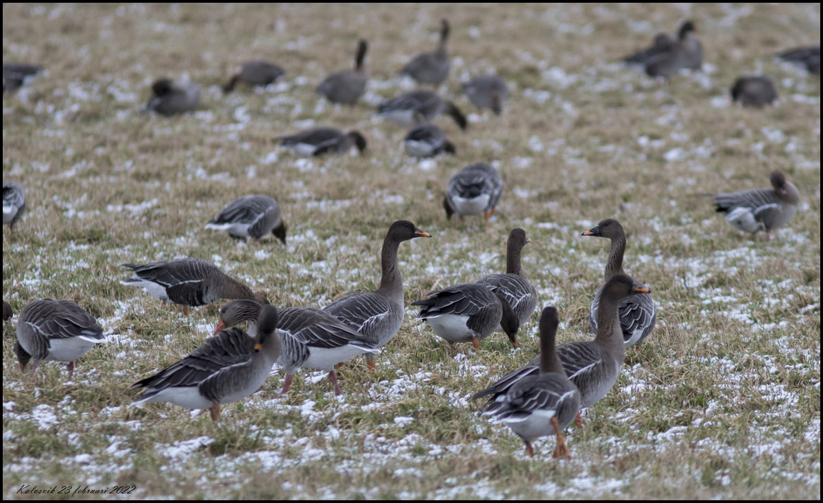 | 23 februari. Vid bilverkstaden i Kalvsvik fanns idag flera hundra gäss av fem arter. Förutom säd-, grå-, kanada-, och bläsgås fanns också ett antal spetsbergsgäss. |