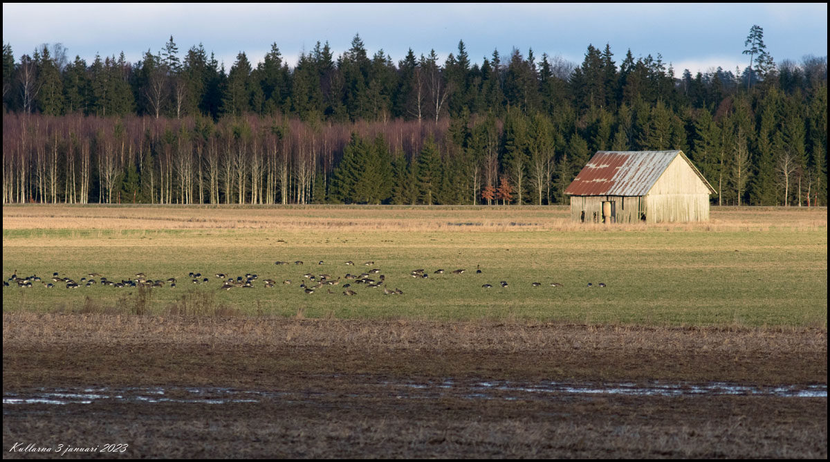 | 3 januari. Sädgäss vid "bussdungen". I flocken fanns också enstaka exemplar av grå-, bläs- och spetsbergssgås. |
