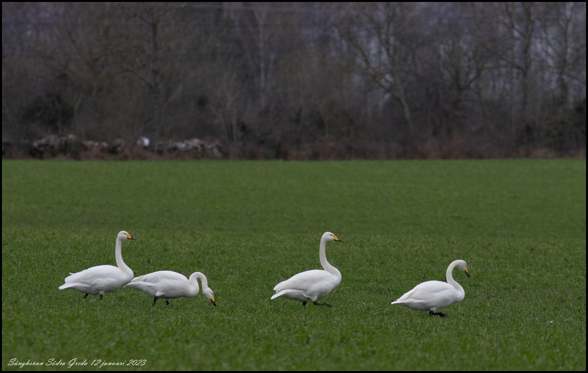 | 12 januari. Sammanlagt 78 sångsvanar rastar vid Södra Greda |