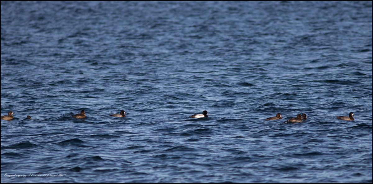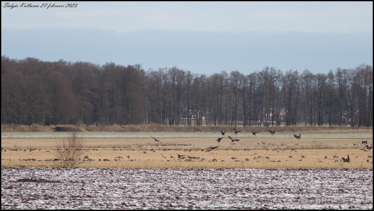 | 27 februari. Minst ett par tusen gäss av sex olika arter rastar söder om Kullarna. Eller finns den sjunde arten där också, fjällgåsen? Vi hittade den inte. |