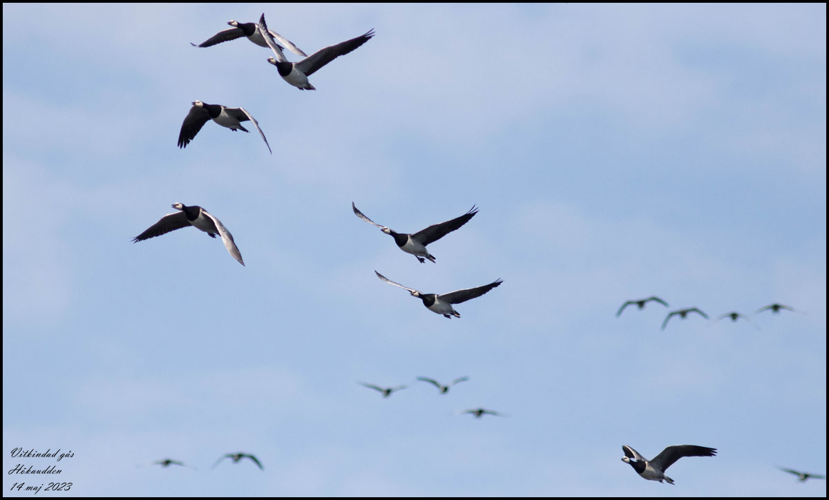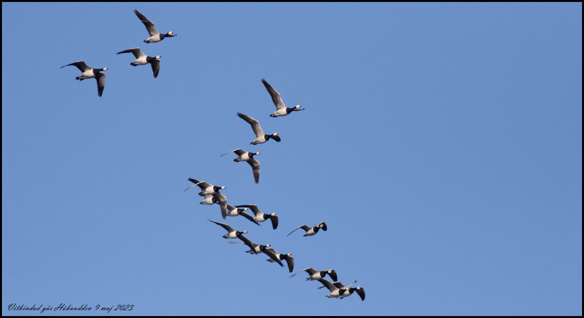 | 9 maj. Idag sträckte många vitkindade gäss, vid Hökaudden drygt 2000, men de var bara en liten del av alla som sågs i Småland. |