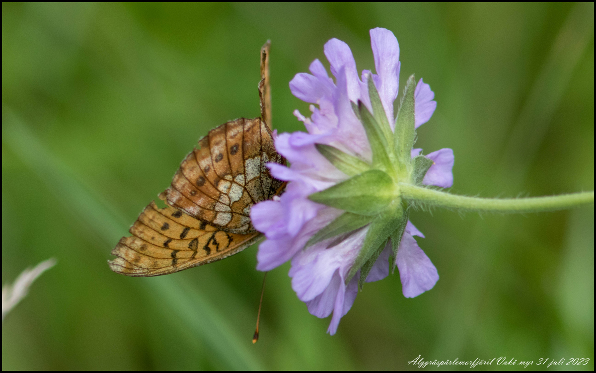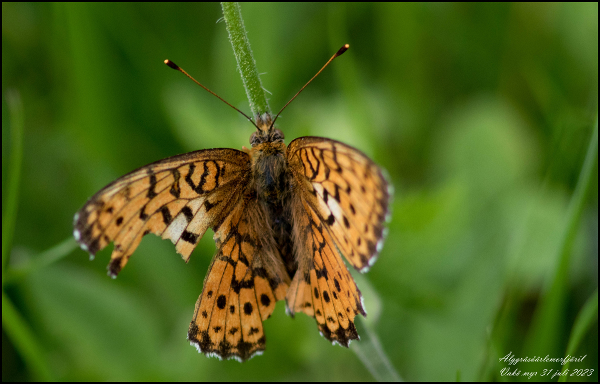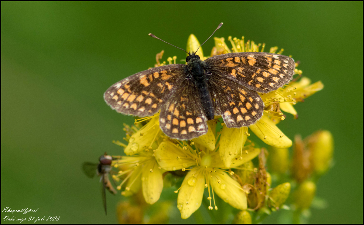 | 31 juli. Skogsnätfjäril på fastmarken längs stigen ut till berget på Vakö myr. | |