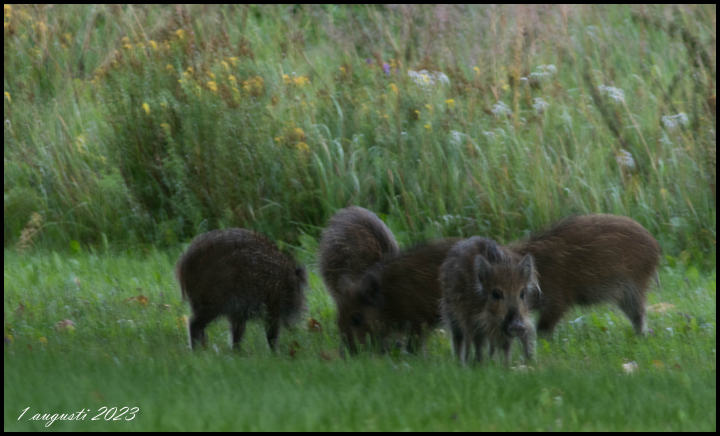 | 1 augusti. Vildsvinen är på besök igen. Nedrans vilken fart det blir då jag stormar ut från huset! |