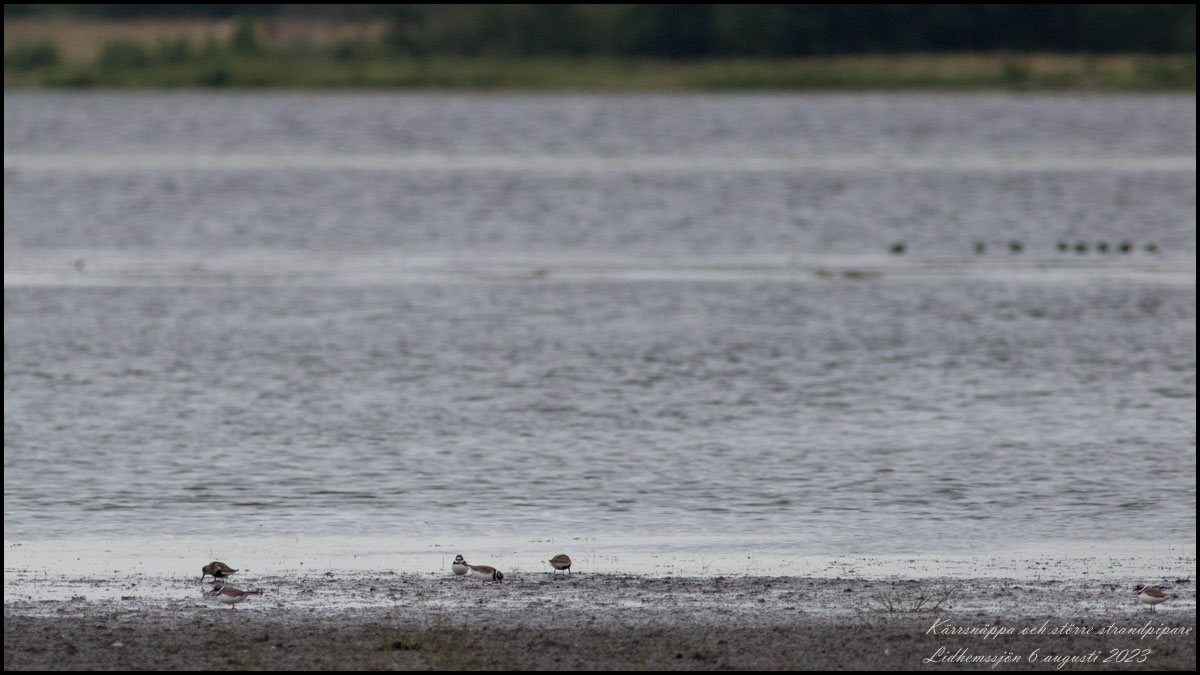 | 6 augusti. Kärrsnäppa och större strandpipare i sydvästra delen av Lidhemssjön. Krickor i bakgrunden. |
