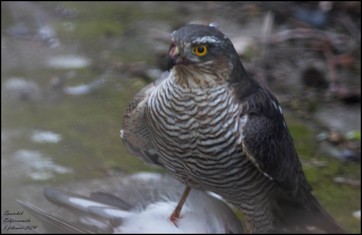 | 5 februari. En sparvhök slog en skata intill husets baksida. Jag kunde ta bilder genom glasrutan så kvaliteten kunde ha blivit bättre. |