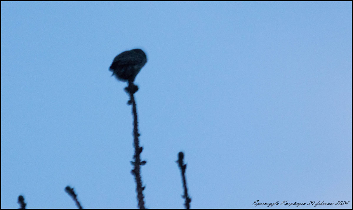 | 20 februari. Sparvuggla, suddig i det sena kvällsljuset beroende på en klantig fotograf. |