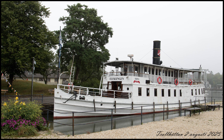 | 2 augusti. Vi har åkt med den här gamla båten till slussen vid Vänersborg och tillbaka. Den heter Elfkungen och är 150 år gammal. |